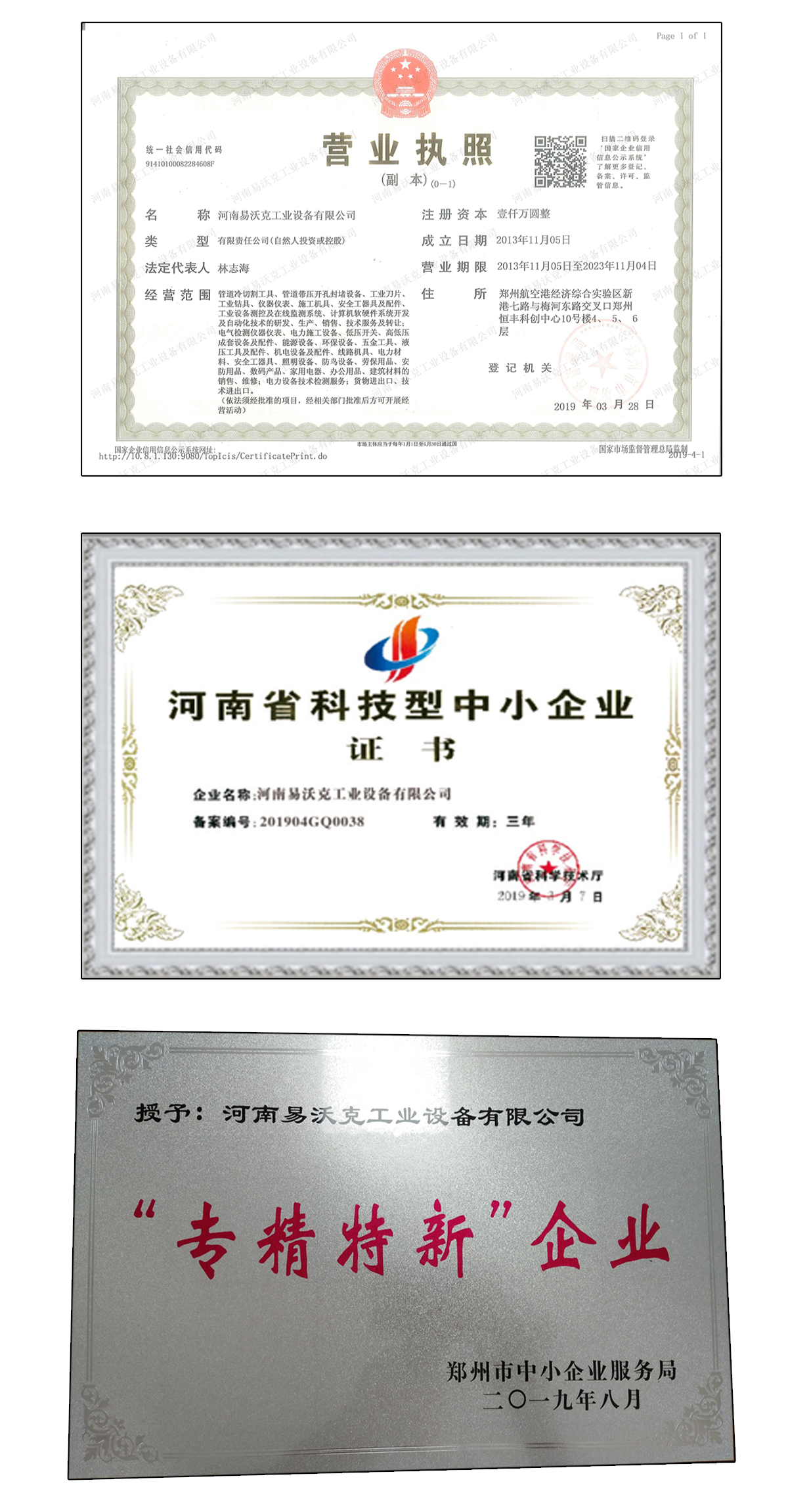 易沃克營業(yè)執(zhí)照,科技型中小企業(yè)證書,“專精特新”企業(yè),易沃克榮獲重質(zhì)量守信用企業(yè)、重合同守信用企業(yè)、重服務(wù)守信用企業(yè),誠信經(jīng)營示范單位、誠信供應(yīng)商企業(yè)證書、企業(yè)資信等級證書。